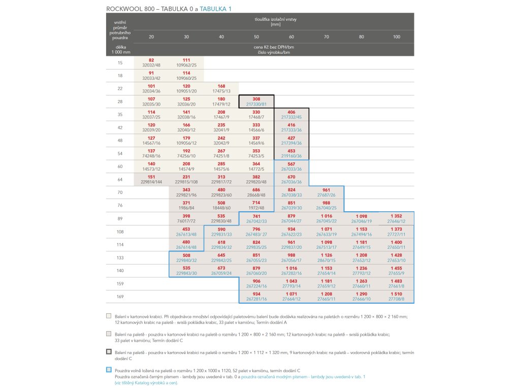 Balení: Pouzdra ROCKWOOL 800 jsou balena do kartonových krabic o rozměru 1 020 × 392 × 391 mm s označením výrobce a základními údaji o výrobku na štítku. Kartonové krabice jsou uloženy na nevratné dřevěné paletě o rozměru 1 200 x 800 x 2 160 mm. Palety se skladují v jedné vrstvě. ROCKWOOL je zapojen do systému sdruženého plnění povinností zpětného odběru a využití odpadů z obalů „Systém tříděného sběru v obcích EKO-KOM“.
